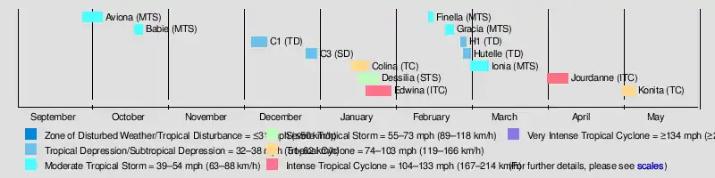 During the season, the Météo-France office (MFR) on Réunion island issued warnings in tropical cyclones within the basin. The agency estimated intensity through the Dvorak technique,[4] and warned on tropical cyclones in the region from the coast of Africa to 90° E, south of the equator.[5] The Joint Typhoon Warning Center (JTWC), which is a joint United States Navy – United States Air Force task force, also issued tropical cyclone warnings for the southwestern Indian Ocean.[6] The storms in the season lasted about five days on average, although Cyclone Edwina lasted the longest at 11 days. Storms formed throughout the basin and were fairly evenly distributed throughout the season, with the exception of a lull in November. Most storms originated from the Intertropical Convergence Zone (ITCZ). MFR named storms throughout the season using 11 names from a sequential list.[4] The remainder of the list was Laura, Monette, Neige, Octavie, Pamela, Rosita, Stella, Tasiana, Vigonia, Wendy, and Yolande.[7]