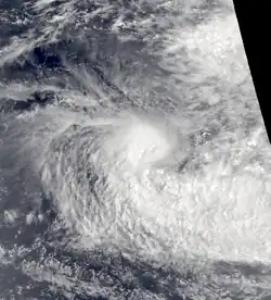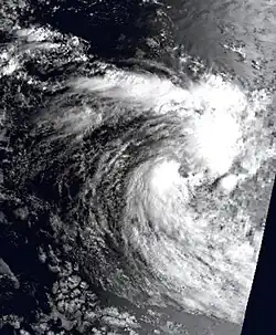 A few days after Colina formed, the ITCZ spawned another area of convection on January 16 in the northeast portion of the basin. The next day, a low-pressure area formed between the Chagos Archipelago and Diego Garcia, and on January 19 the system developed into a tropical disturbance after convection increased. Following further organization, the system intensified into Tropical Storm Edwina on January 20 while moving generally westward. Increasing wind shear prevented significant strengthening initially, but Edwina was able to intensify more on January 21.[4] On January 23, the JTWC upgraded the storm to the equivalent of a minimal hurricane on the same day that MFR upgraded Edwina to tropical cyclone status. On the next day, the JTWC estimated the cyclone attained peak winds of 205 km/h (125 mph),[13] after Edwina developed a well-defined 75 km (47 mi) wide eye.[4] On January 26, the MFR estimated that the cyclone reached peak 10-minute winds of 170 km/h (105 mph),[13] making Edwina the strongest storm of the season. Around that time, the cyclone turned more to the south around a large ridge,[4] maintaining peak winds through January 27. By that time, the eye became large and ragged while passing halfway between Rodrigues and St. Brandon. On January 27, Edwina passed about 220 km (140 mi) east of Mauritius. On the next day, increased wind shear caused marked weakening, quickly destroying the eye and lowering the winds below tropical cyclone force. On January 29, Edwina ceased existing as a tropical system, although its remnants persisted several more days, affecting Île Amsterdam in the south-central Indian Ocean on February 2.[4]