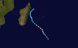 The ITCZ spawned an area of convection on January 11 near the Chagos Archipelago. A circulation developed within the system on January 13 about 400 km (250 mi) southwest of Diego Garcia, and at that time it became a tropical disturbance. A large ridge to the south steered the system generally to the southwest. The disturbance intensified into a depression on January 14,[4] the same date that the JTWC initiated advisories on Tropical Cyclone 10S,[6] and following an increase in convection, the depression intensified into Moderate Tropical Storm Colina on January 15. Turning more to the south-southwest, Colina strengthened further into a tropical cyclone on January 18, developing a 30 km (19 mi) eye.[4] On the next day, the cyclone attained peak 10-minute winds of 135 km/h (85 mph), according to MFR, while the JTWC estimated peak 1-minute winds of 175 km/h (110 mph).[10] That day, the eye crossed over the western portion of Réunion at around 14:30 UTC, exiting 45 minutes later. Subsequently, Colina accelerated to the southeast over cooler waters, weakening in the process. On January 20, the cyclone weakened to tropical storm status, and the next day Colina became extratropical, dissipating two days later.[4]