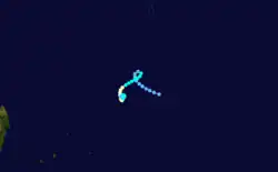 In addition to the 11 named storms, one of which failed to attain tropical storm status, there were several additional systems. The first was Tropical Depression C1, that originated from the ITCZ in the northeastern portion of the basin from a small area of convection on November 24. It moved westward with pulsating convection around the center, failing to organize due to the presence of wind shear. On December 4, the system organized into a tropical disturbance, and three days later it passed about 400 km (250 mi) north of the northern tip of Madagascar.[4] That day, it intensified to tropical depression status, reaching peak winds of 50 km/h (30 mph).[20] Increased wind shear weakened the convection, and the circulation dissipated on December 10.[4] On December 18, a tropical low developed in the Australian basin northeast of the Cocos Islands. It moved southwestward, intensifying into a tropical storm and being named Ken by the BoM. Wind shear in the region prevented much development, and the storm crossed into the south-west Indian Ocean on December 21.[21] At that time, the MFR classified the system as Tropical Depression C2, but the agency only issued two warnings.[4] The JTWC tracked the system until December 23 when the system dissipated well to the southwest of Indonesia.[6]