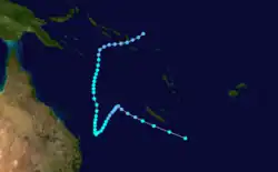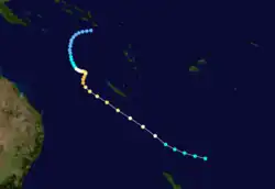 Developed in the Australian region of the Coral Sea far offshore from Queensland. The cyclone intensified to a Category 3 severe tropical cyclone (Australian intensity scale) before crossing into the South Pacific region where it passed to the southwest of New Caledonia.[17]