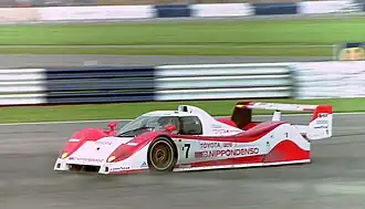 Having taken a year out from the championship, Toyota returned with a new SWC car, the TS010. This was the first racing Toyota not designed by a Japanese engineer, but instead came out of the TOMS-Europe facility.[17] Tony Southgate, designer of Jaguar's Le Mans-winning XJR-12, was brought on board as project co-ordinator. The car was built around the completely new 3.5-litre RV10 engine. The all-aluminium block had a 72° V10 with two valves per cylinder and could develop 660 and was fitted to a 6-speed gearbox. The chassis was a carbon/kevlar composite, with a very low profile and, like Peugeot, developed strong downforce with a large twin-plane rear wing.[17] The car was unveiled for the last race of the ’91 season and had a good start to the new season by winning the opening round at Monza by default, albeit as the sole classified finisher. Drivers Geoff Lees and Hitoshi Ogawa had raced for the team for a number of years, however Ogawa was tragically killed in May in an All-Japan Formula 3000 race.[18][14] His place was taken by Australian David Brabham (ex-Jaguar) with Ukyo Katayama as the third driver. The second car had also pulled in drivers from the TWR team, with Jan Lammers and Andy Wallace who had reigning Drivers Champion Teo Fabi as their drop-in third driver. The third car would be driven by Kenny Acheson/Masanori Sekiya/Pierre-Henri Raphanel.