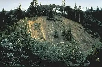 The sequence of earthquakes caused widespread landslides from the coast to east of Scotia and from the northern extent of the Eel River basin near Thompson Hill to south of Petrolia. Most of these were existing landslides that had been re-initiated and the largest of the slides were either slumps or bedding plane failures along the coastal bluffs. Several slump failures between Guthrie Creek and Oil Creek stretched from the bluffs towards the shore for a distance of 150 meters (490 ft), leaving some of the slide to be eroded by the surf. The road between Ferndale and Petrolia was closed for more than a week where about six mostly minor landslides blocked the passage, with the roadway itself sustaining light damage due to sliding or settlement of the road fill in a few instances. One of the largest slides occurred along the railroad tracks at the Scotia bluffs where previous slides had taken place. That slide also took about a week to clear.[14]