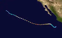 During the season, twenty-seven tropical cyclones formed in the Eastern Pacific (east of longitude 140°W), and twenty-four developed further and became tropical storms. Both of these figures constitute records in the basin, as the 1992 season surpassed the season with the most tropical cyclones (1982, 26) and the season with the most named storms (1985, 22). Of these, fourteen reached hurricane strength and eight became major hurricanes—storms that reach Category 3 or higher on the Saffir-Simpson Hurricane Scale.[5]