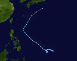 Early the next day, Bobbie intensified into a severe tropical storm.[9] At that time, the JTWC claimed that Bobbie had intensified into a typhoon,[9] while the JMA noted that Bobbie had actually became a typhoon several hours later.[5] On 18:00 UTC on 26 June, Bobbie peaked with 1-minute sustained winds of 140 mph (220 km/h) as it tracked the western extent of the mid-level subtropical ridge.[9] Several hours later, Bobbie peaked with 10-minute sustained winds of 105 mph (165 km/h).[5] As Bobbie began recurving east of Taiwan at 12:00 UTC that day, increasing southwesterly winds caused Bobbie to steadily weaken. Passing over Miyako Jima on 28 June and then just southeast of Okinawa on 29 June, Bobbie began undergoing an extratropical transition on at that time.[9] At that time, Bobbie weakened into a severe tropical storm as it left the PAR, causing PAGASA to stop issuing advisories on the storm.[9] As Bobbie transitioned into an extratropical storm, the JTWC issued their final warning on the system the next day, prior to it brushing the southern tip of Honshu.[9] The JMA noted that Bobbie became extratropical early the next day, prior to it dissipating on 3 July.[5]