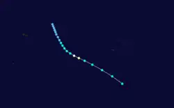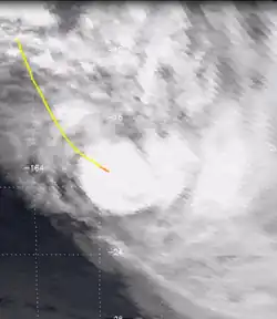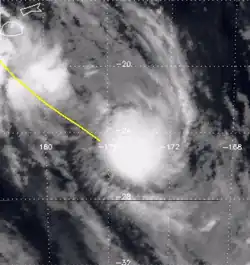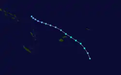 On December 30, the FMS reported that a tropical depression had developed about 860 km (535 mi) to the northeast of Pago Pago in American Samoa.[15] Over the next couple of days, the system moved towards the south-southeast and gradually developed further before the NPMOC designated the depression as Tropical Cyclone 05P.[11][5] During January 1, TCWC Nadi reported that the depression had developed into a Category 1 tropical cyclone and named it William as it passed near the Cook Island of Autitaki.[5] During the next day, William subsequently slowly accelerated as it passed near to or over several other Cook Islands and intensified into a Category 2 tropical cyclone.[5]