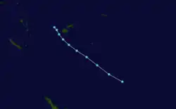 A persistent cloud mass east of the Solomon Islands evolved into a tropical depression on November 12, according to the FMS.[8][4] Located about 245 km (150 mi) northeast of Tikopia, the system had gale-force winds developing on its southern side.[8][9] The depression moved south-eastwards at first, before it turned southwestwards through Temotu Province towards Vanuatu, which prompted the FMS to start issuing special weather bulletins for the island nation during November 13.[8][9][10] Later that day, the JTWC initiated advisories, designating it Tropical Cyclone 01P. On November 14, the FMS named the system Vania, after it had become a category 1 tropical cyclone on the Australian scale.[8][9][11] Intensifying further, Vania moved through northern Vanuatu on November 15 as a category 2 tropical cyclone.[9] Later that day, the FMS predicted that Vania would become a hurricane and issued a hurricane warning; however, Vania had peaked as a category 2 tropical cyclone with peak 10-minute sustained windspeeds of between 100 km/h (65 mph), while the JTWC estimated that the system had peaked with 1-minute sustained windspeeds of 110 km/h (70 mph).[9][11][8] Over the next couple of days, the system stalled and started to move westwards, before the FMS and JTWC issued their final advisories on the cyclone during November 18, as it had weakened below tropical cyclone intensity and degenerated into a sheared depression to the north of New Caledonia.[8][9][11] The remnant low-level circulation was last noted during November 19, while they were located about 80 km (50 mi) to the west of Port Vila.[9]