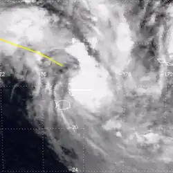 During December 13, a tropical depression developed about 1055 km (655 mi) to the northeast of Suva, Fiji.[14] The system subsequently moved south-eastwards towards Fiji and gradually developed further before the NPMOC designated the system as Tropical Cyclone 04P and initiated advisories on the depression during December 15.[14][11] At this time, the system was located about 110 km (70 mi) to the northeast of Labasa, Fiji, and was estimated to have maximum 1-minute sustained wind speeds of 65 km/h (40 mph).[2] Over the next couple of days, the system passed through Fiji's Lau Islands and Tonga's Haʻapai Group of islands before being declared extratropical as it moved below 25S and into MetService's area of responsibility.[2][14] Within Fiji, there were no reports of any casualties, damage, or gale-force winds associated with the system; however, several pressures of between 995–1000 hectopascals (29.38–29.53 inHg) were reported.[14]
