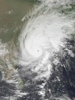 Along the coast of Bangladesh, Cox's Bazar reported winds of 93 km/h (58 mph).[3] The storm brought heavy rainfall and produced high waves that flooded offshore islands with a 0.91 to 1.22 m (3 to 4 ft) storm surge. Most residents of the offshore islands were evacuated ahead of the storm,[21] totaling 300,000 evacuees. About 10,000 huts were destroyed, mostly made of mud and straw, while crops in the region were damaged. The storm's winds cut power lines and communication links in the hardest hit areas.[22] Initially, about 500 fishermen were missing after the storm's passage; most were rescued or swam ashore, but over 100 people were killed when 10 boats were lost.[23] The International Disaster Database listed 172 fatalities associated with the storm.[17] In neighboring Myanmar, the cyclone destroyed most of the rice crop in Rakhine State just before the harvest, forcing many Rohingya farmers to borrow money to compensate for lost income.[24]