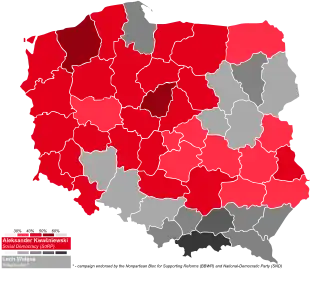 Presidential elections were held in Poland on 5 November 1995, with a second round on 19 November.[1] The leader of Social Democracy, Aleksander Kwaśniewski, and incumbent President Lech Wałęsa advanced to the second round. Kwaśniewski won the election with 52% of the vote in the run-off against 48% for Wałęsa.