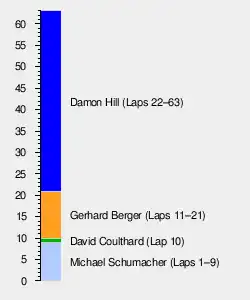 In the midfield the returning Mansell collided with Eddie Irvine in the Jordan and both had to pit. The race ended up being 1992 champion Mansell's last race finish.