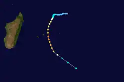 On February 16, Cyclone Victor crossed into the basin from the Australian Region with a well-defined circulation but little convection. Despite being downgraded to a tropical disturbance, the system was named Cindy by the Mauritius Meteorological Service on February 16. The system continued gradually weakening while turning more to the southwest, dissipating on February 19.[1] This marked the end of a 50‑day period in which the related storms Katrina and Victor-Cindy were active.[15]