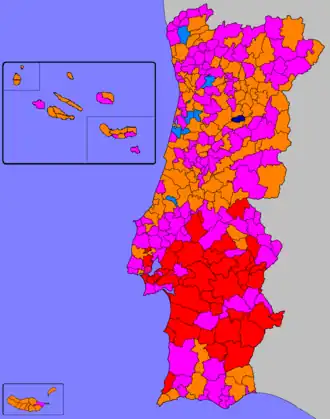 - ^ Number of municipalities won between PS-only lists and lists with other parties. PS-only lists: 127; PS-coalition lists: 1.
