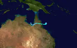 A tropical disturbance was first noted by JTWC over the Gulf of Carpentaria on 25 December. The system deepened as it moved slowly westward over the next two days. The disturbance continued to intensify over the Northern Territory, until it stalled over the border of Queensland for a couple of days. On 30 December the system moved over water and began to develop further, prompting TCWC Brisbane to issue a Tropical Cyclone Watch for portions of the southern Gulf coast. The low turned south-southeast shortly afterwards, and warnings were canceled when it became apparent that the center moved back inland. The system weakened over northwestern Queensland and dissipated on 2 January.[2]