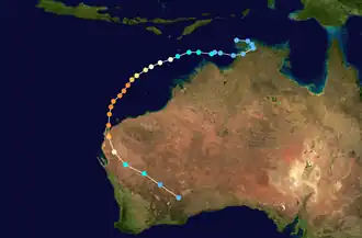 On 3 December a tropical depression formed in the Arafura Sea, 250 miles east-northeast of Darwin. The system drifted southwestward, strengthening into Tropical Cyclone Thelma on 6 December. Thelma continued to intensify as it turned to the south-southwest, reaching Category 5 strengthen on the Australian cyclone scale as it brushed the Tiwi Islands.[4] Cyclone Thelma reached a peak of 140 mph with a minimum pressure of 925 mbar on the 8th, and made landfall on the western Australian coastline on the 10th. After making landfall, the storm paralleled the coastline, and rapidly weakened to a tropical storm. Favorable conditions aloft allowed it to remain a tropical storm until the 15th, when the storm dissipated near Port Hedland. Thelma was responsible for moderate rainfall and downed trees, but caused no casualties due to the sparse population of where it hit.