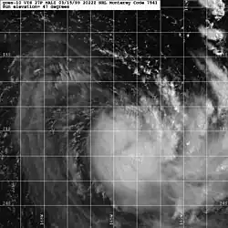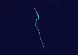 Early on March 11, the NPMOC and the FMS started to monitor a tropical disturbance that had developed within the South Pacific Convergence Zone between the Southern Cook Islands and French Polynesia.[1][7] Later that day as the disturbance moved towards the southwest, the FMS reported that it had developed into a tropical depression while located about 485 km (300 mi) to the east of the Cook Island: Aitutaki.[8] Under the influence of diurnal effects and significant vertical shear the depression slowly developed over the next couple of days while drifting through the southern Cook Islands.[8] By 1800 UTC on January 12, the depressions low level circulation centre had moved under the deep convection, as result the FMS then reported that the system had developed into a tropical cyclone and named it Hali.[1] At the same time the NPMOC initiated advisories on Hali and designated it as Tropical Cyclone 27P, while it was equivalent to a tropical storm with 1-minute sustained windspeeds of 65 km/h (40 mph).[7][9] After it was named Hali moved towards the west, before early on January 13, the NPMOC reported that Hali had reached its 1-minute peak intensity of 95 km/h (60 mph).[7]