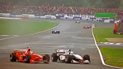 David Coulthard, driving on intermediates, spun out on lap 38 whilst passing a backmarker. Jarno Trulli spun out on the same lap as Coulthard as Barrichello spun out and hit the wall at Club on lap 40. His McLaren-Mercedes team-mate Mika Häkkinen had built up a lead of 49 seconds over second place driver Michael Schumacher when four laps later he went off the track, did a complete 360 degrees turn before continuing. The incident damaged the front wing of his car and cost him 10 seconds of his lead but following numerous other spins caused by the worsening conditions the safety car was deployed which slowed the cars down, and removed Häkkinen's advantage over Schumacher altogether.[2]