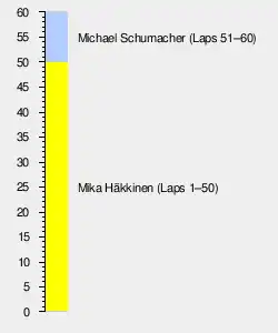 The race restarted on lap 50 and it took only two laps for Häkkinen to make another mistake, which put Schumacher in the lead. The German quickly pulled away from his rival, who was now nursing his McLaren home.