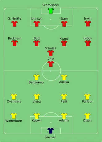 Arsenal employed a traditional 4–4–2 formation: a four-man defence (comprising two centre-backs and left and right full-backs), four midfielders (two in the centre, and one on each wing) and two centre-forwards.[22] Manchester United organised themselves slightly differently, and lined up in a 4–4–1–1 formation with Paul Scholes playing ahead of the midfield in a supporting role behind the main striker, Andy Cole.[22]
