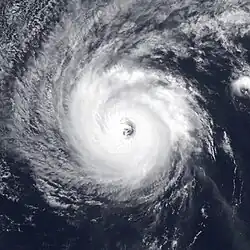 Located in an area conducive to further development, Darby attained hurricane status on July 24, subsequent to the development of a 17-mile (27 km)-wide eye.[17] The eye became more distinct while surrounded by an area of deep convection, and on July 25 the hurricane reached peak winds of 115 mph (185 km/h) about 850 miles (1,370 km) southwest of Cabo San Lucas.[18] The eye soon disappeared on satellite imagery, believed to be from an eyewall replacement cycle, and Darby's winds weakened to about 105 mph (169 km/h). A 25-mile (40 km) eye next developed, and on July 26, the hurricane re-intensified to reach peak winds of 115 mph (185 km/h).[17] For a 30-hour period, Darby attained the characteristics of an annular hurricane, retaining a well-defined structure with few banding features for an extended period.[19] The hurricane began to weaken while entering an area of cooler water and increased wind shear, and after crossing into the jurisdiction of the Central Pacific Hurricane Center, Darby weakened to a tropical storm on July 29. The storm degenerated into a tropical depression on July 31, and early on August 1, Darby dissipated a moderate distance north of the Hawaiian Islands. It never affected land.[17]