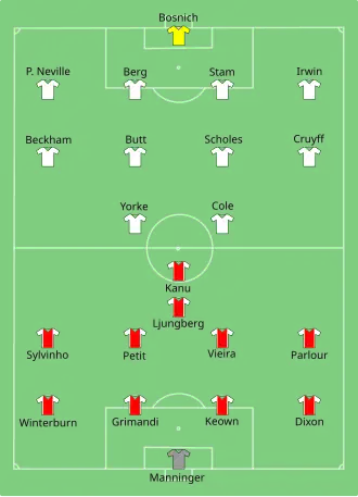 Defender Jaap Stam, "nursing an Achilles injury all summer", was substituted in the second half for David May.[25] Arsenal began the half the better of the two teams and Vieira believed he earned his team a penalty in the 49th minute – it was turned down by Barber. The substitution of Sylvinho for Luis Boa Morte in the 64th minute allowed Ljungberg to play in a natural midfield role.[29] Two minutes later, Arsenal were awarded a penalty. Vieira, chasing down the ball was adjudged to have his shirt tugged by Irwin in the 18-yard box. Kanu converted the penalty, sending Bosnich the wrong way.[29] Yorke soon after mistimed his goal effort after being sent clear by Cole.[29] Substitute Ole Gunnar Solskjær then put Cole through, only for Manninger to produce a one-handed save.[29] Arsenal scored what proved to be the match winner in the 78th minute. A goal-kick by Bosnich was headed back into United's half by Vieira; Kanu controlled the ball "deftly" and set up Parlour, whose shot went into the net.[25] Teddy Sheringham was brought on by Ferguson for Butt with nine minutes of normal time remaining, but with a fourth striker on the field, United were unable to score an equaliser.[28] Luzhnyi later came on for Parlour, the final substitution of the match.[28]
