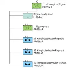 The 1st Airmobile Brigade (German: Luftbewegliche Brigade 1) was a brigade in the German Army with its headquarters at the Fritzlar Air Base in North Hesse, It was part of the Airmobile Operations Division (Germany). The various elements of the brigade were located in the federal states of Lower Saxony, Hesse and Bavaria. Parts of the brigade were classed as intervention forces.