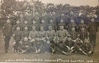 When the Territorial Force (TF) was created from the old Volunteer Force under the Haldane Reforms of 1908,[11][12][13] the 1st Hampshire RGA (V) was to join with the Dorsetshire RGA (V) once again to become the Hants & Dorset RGA, but this was changed back to separate Dorset and Hampshire units in 1910. The Hampshire RGA had the following organisation:[6][8][14][15][16][17][18][19]