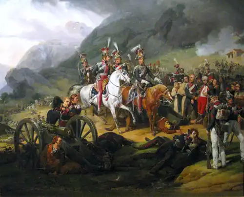 On 30 November 1808 their most famous charge up the Somosierra Pass took place. That day the 3rd Squadron under Kozietulski (ad interim)[37] was on duty as a personal escort to the Emperor. After the failure of the French infantry attack, Napoleon ordered Polish chevaulegers to take the pass defended by 3000 men and four batteries of Spanish cannons. The narrow road to the top (300 meters level difference, 2,500 meters long), bordered from both sides with waist high stone walls, lined with poplar trees, precluded a demi-squadron or even a troop frontal attack. This was why the attack was conducted in a column four horses wide.[38] After the first battery was taken, chevaulegers, without slowing the full gallop charge, gained the top of the pass in about eight minutes. All four batteries were taken, and the road to Madrid opened for Napoleon's Army. The charge was led by Kozietulski who, however, lost his horse after taking the first battery. The squadron was then joined by Lt. Andrzej Niegolewski, who had previously been on reconnaissance with his troop. The charge was continued under Dziewanowski, and when he fell from his horse after taking the third battery, by Piotr Krasiński. The charge, which continued to the last battery, was led by Niegolewski, who miraculously survived when the Spanish attacked him (he received nine wounds from bayonets and two carbine shots to the head).[39]