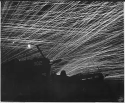 ![]() Anti-aircraft fire from Marine AAA Battalions in the vicinity of Yontan Airfield lace the sky during the Battle of Okinawa. | |