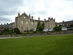 Further militia regiments had been raised in Lancashire after 1852, bringing the total to seven of infantry and one of artillery. Each had its own recruiting areas across the county, those of the 1st RLM being Bolton (Great and Little), Fylde, Lancaster and Manchester.[35][89][90] During the Crimean War the depot of the 1st RLM built a barracks on Windy Hill at Lancaster for 200 men and a storehouse with a parade ground for 800 men later known as Springfield Barracks. Plans to convert some old warehouses at St Georges Quay were scrapped when the war ended. Annual training for the 1st RLM resumed in 1857. It was usually held on Giant Axe Field, but at Ulverston when camp coincided with elections in Lancaster. In some years a joint field day was held with one of the Lancashire Rifle Volunteer Corps during annual training. From 1876 the regiment adopted the practice of camping at Scale Hall field, about 2 miles (3.2 km) from Lancaster, during its annual training.[92][93]
