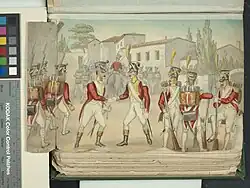 The regiment had a full regimental band which participated in the Russian campaign. In 1805, the uniform jacket of the regimental drummers appeared to have been adapted from that for the 3rd Swiss Demi-Brigade – blue with yellow collar, cuffs, cuff flaps, and lapels, all trimmed with gold-laced and piped with sky blue. The drummers also wore red 'swallow's-nest' ornaments, trimmed yellow, on their shoulders.[8]