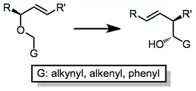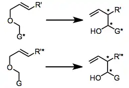 The asymmetric induction approach relies on stereocenters already set in the starting material that are unaffected by the reaction (chiral auxiliaries). The most success has been achieved by placing these stereocenters either in the G group[8] or in a substituent attached to the end of the double bond.[9] Diastereomeric ratios in excess of 90:10 are common for these reactions; however, removal of the chiral auxiliary is sometimes difficult.[10]