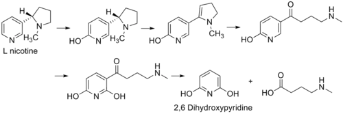 2. ^ Gherna, R; et al. (1965). "The Bacterial Oxidation of Nicotine VI. The Metabolism of 2,6-dihydroxypseudooxynicotine". J. Biol. Chem. 240 (9): 3669–3674. doi:10.1016/S0021-9258(18)97197-8. PMID 5835946.