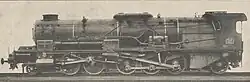 This most unusual wheel arrangement was only ever used on the PLM 151.A class, a French duplex locomotive type built in 1932 for the PLM.[1] Although a rigid locomotive, not articulated, it had some similarities to a Mallet as it was a compound with the two groups of drivers driven by the high pressure cylinders for the rear 6-coupled group and the low pressure for the front 4-coupled group. As the two groups of drivers were also linked with inside coupling rods through inside cranks on the second and third drivers, André Chapelon considered that this made the locomotive a 2-10-2 rather than a duplex,[2] which was also consistent with the PLM numbering as 151. Linking the drivers did not transfer appreciable power between them, but it did keep them synchronised in phase, so that the pistons moved as a balanced locomotive.[2] Power from each pair of cylinders was shared in the ratio 2:3 to distribute power equally across each wheelset.[2]