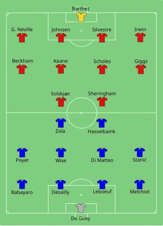 The match kicked off at 15:00 local time under cloudy skies and in front of 65,148 spectators.[18][19][25] Manchester United had the first chance after seven minutes, when Teddy Sheringham was fouled by Frank Leboeuf and the resulting free-kick taken by Beckham went straight into the Chelsea wall.[26][27] A minute later, Hasselbaink set up his teammate Stanić,[25] whose shot from 12 yd (11 m) went wide to the left of the Manchester United goal post.[27][28] The first sign of tension between the players came after 15 minutes when Roy Keane and Gus Poyet clattered into each other during a 50–50 tackle.[28] The referee did not take any action.[26][29] Gianfranco Zola beat Gary Neville on the left wing and put in a cross,[20][25] only for Stanić to head wide from the back post.[30] Hasselbaink then took possession when he forced Mikaël Silvestre to rush his shot which then went wide of the goal.[22][26][28] Ferguson made a substitution in the 19th minute bringing on Jaap Stam for Silvestre,[22] who had suffered a hip injury.[28]
