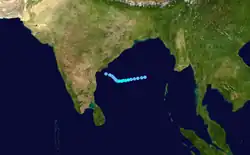 A near-equatorial trough spawned a low-pressure area on December 22 in the central Bay of Bengal. A circulation within the system developed into a depression on December 23 about 500 km (310 mi) east-southeast of Sri Lanka.[4] A low-latitude storm, the system organized while moving slowly westward.[15] On December 24, the depression strengthened into a deep depression, and the following day into a cyclonic storm,[4] the same day that the JTWC classified it as Tropical Cyclone 04B.[15] An eye developed in the center of the blossoming convection, and the system rapidly intensified into a very severe cyclonic storm on December 26. According to the IMD, the cyclone attained peak winds of 165 km/h (105 mph), and made landfall at that intensity along eastern Sri Lanka near Trincomalee around 12:00 UTC on December 26.[4] The JTWC assessed lower winds of 120 km/h (75 mph).[15] Weakening quickly over land, the storm emerged into the Gulf of Mannar on December 27 and failed to restrengthen. Later that day, it made a second landfall in extreme southern India near Thoothukudi as a cyclonic storm. Continuing westward, the system emerged into the Arabian Sea on December 28 as a depression and degenerated into a remnant low. On the next day, the remnant low merged with a trough and spread rainfall northward through India.[4]