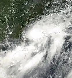On July 13 a cluster of thunderclouds grouped together to form a low pressure area. On July 14 it started to organize and slowly became a tropical depression on July 19, and quickly intensified into a tropical storm. On July 22 convection was displaced to south of the storm's center due to high wind shear, and caused it to dissipate.