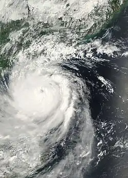 The first storm of the season started out as a tropical low near Palau on May 3, when the JTWC first gave the system a poor chance of formation. However within the next few hours the low quickly organized, and the next day the JMA recognized the low as a depression. Operationally it wasn't until May 5 that the JTWC issued its first warning for the newly formed depression. Drifting northwest the depression gradually organized into a tropical storm on May 6. It was given the name Asiang on May 6 by PAGASA[4] and Damrey on May 7 by the JMA, respectively. At this time a weakening sub-tropical ridge was moving northward causing Damrey to move in a northeasterly direction. Damrey became a typhoon early on May 8 and soon thereafter satellite images began to show an eye forming at the center. During the next 24 hours Damrey quite steadily intensified, reaching winds of 130 mph (215 km/h) by May 9. The system became very symmetrical and small, allowing the typhoon to reach a peak intensity of 180 mph (290 km/h) and gusts as high as 220 mph late on May 9. The JTWC unofficially estimated a pressure of 878 mbar, which would make it one of the strongest tropical cyclones ever. Due to the compact structure of the typhoon it would only take twenty-four hours of high vertical wind shear, from a nearby high pressure, to reduce Damrey to a tropical storm. The convection continue to decrease around the LLCC and the system picked up in forward momentum under deteriorating environment.[5] By May 12 Damrey became fully extra-tropical and eventually dissipated on May 16.[6]