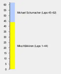 At the front, the gap between Häkkinen and Michael Schumacher fluctuated as they lapped slower cars ahead of them, and Häkkinen set the race's fastest lap on lap 60, a 1:26.523.[2][65][67] Trulli went onto the grass beside the track on lap 61, becoming the Grand Prix's final retirement because he was stuck in sixth gear.[61][62][69] Michael Schumacher held off Häkkinen in the last laps and crossed the finish line first, claiming his third win of the season and 38th overall.[78] Häkkinen was 1.1 seconds behind in second, and his team Coulthard was 50 seconds behind in third.[2] Barrichello finished fourth, the last driver on the same lap as the race winner. Villeneuve came fifth, holding off Salo, who scored his and Sauber's first championship point of the season in sixth despite losing time to the former when he was lapped by Michael Schumacher and Häkkinen.[34][45][58][64] Irvine finished seventh after mid-race clutch troubles stopped him from improving his starting position.[58][64] Diniz was eighth after overshooting his pit box and losing time at his pit stops. Wurz took ninth, experiencing car control issues over bumps.[74] The one-stopping Herbert and Fisichella as well as Zonta (whose exhaust cracked), Mazzacane, Verstappen and Trulli (despite his retirement) were the final classified finishers.[2][3][74]