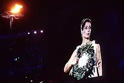 After a brief fanfare composed by David Stanhope, Christine Anu performed with Torres Strait Island dancers her rendition of the Warumpi Band's song "My Island Home" written by Neil Murray. She performed on the Geodome Stage, with several Aboriginal dancers atop the stage, around which several hundred kids holding umbrellas and lampboxes created images of Aboriginal Dreamtime. The song version who was performed was the recently released Earth Beat mix, which is a rerecorded version who had the some parts of the lyrics altered so to evoke that the island sung about is Australia itself.[8][9] Near the end of the song, Anu was hoisted on part of the stage, which was folded into a giant 8-sided octagonal figure called The Geode, which had the globe projected on it. Audience members were encouraged to wave their flashlights.