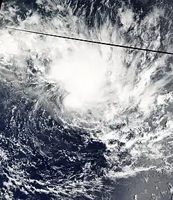 In Gary Pagett's April 2002 monthly tropical cyclone summary, he noted a possible tropical cyclone over the southeast Pacific that displayed features of a tropical or subtropical cyclone.[18] Operationally, the Tropical Cyclone Warning Center in Wellington, New Zealand only issued gale warnings on the system as it was not assessed to have been tropical or subtropical.[19] The system was later studied by Dr. Karl Hoarau of Cergy-Pontoise University in France and is believed to have been a tropical storm.[18] At the end of March, an upper-level trough associated with a cold front developed over the southeast Pacific Ocean. By March 31, a low-level circulation had developed roughly 600 km (370 mi) east of the Pitcairn Islands. Despite moderate wind shear, the system intensified and became a tropical depression early on April 1. Owing to a subtropical ridge to the north, the depression tracked west-southwestward into an area of decreased shear. Subsequently, the system was able to intensify into a tropical storm by the evening of April 2. Though the storm remained shear, throughout April 3 with convection remaining within half a degree of the center of circulation.[19] During the evening hours, an eye-like feature appeared on satellite imagery, and the system simultaneously was estimated to have reached again a peak intensity, but now as a subtropical storm.[20] Hours later, dry air became entrained in the storm's circulation and caused it to rapidly weaken to a subtropical depression. By the afternoon of April 4, the low had become fully exposed and the system was no longer classified a subtropical or tropical cyclone.[19]