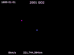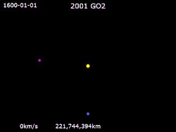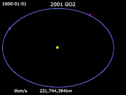2001 GO2 is a very small asteroid and near-Earth object of the Apollo group, approximately 50 meters (160 feet) in diameter. Like 2003 YN107, it is in a co-orbital configuration relative to Earth moving in a 1:1 mean-motion resonance. It was first observed on 13 April 2001, by astronomers with the LINEAR program at the Lincoln Lab's ETS near Socorro, New Mexico, in the United States.[1] 2001 GO2 has not been observed since its short four-day observation period in April 2001.