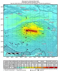 An earthquake occurred in China on 14 November 2001 at 09:26 UTC (17:26 local time), with an epicenter near Kokoxili, close to the border between Qinghai and Xinjiang in a remote mountainous region. With a magnitude of 7.8 Mw (8.1 Ms), it was the most powerful earthquake in China for 5 decades.[3] No casualties were reported, presumably due to the very low population density and the lack of high-rise buildings. This earthquake was associated with the longest surface rupture ever recorded on land at the time, ~450 km.[4]