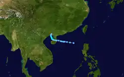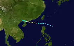 The monsoon trough produced another disturbance that upgraded into a tropical depression to the west of Luzon on June 29. The tropical depression tracked northwestward while a subtropical ridge influenced the depression and caused it to upgrade to Tropical Storm Durian on June 30.[17] The storm attained severe tropical storm status at 18:00 UTC the same day,[13] with 10-minute winds of 110 km/h (70 mph) and 1-minute winds of 140 km/h (85 mph), making it equivalent to Category 1 winds on the Saffir–Simpson scale.[17] Durian had an atmospheric pressure of 970 hPa (29 inHg).[13] Durian made landfall on the Leizhou Peninsula,[13] before rapidly weakening as it continued in the same direction before the JTWC stopped advisories of the storm on July 2,[11] with the JMA doing the same the following day.[13]