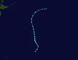 Tropical Depression 09W developed from an area of convection about 1,000 km (620 mi) to the east of Iwo Jima on July 21. Continued consolidation of its convection prompted both the JTWC to classify it as a tropical storm on 18:00 UTC.[27] The JMA followed suit six hours later and named it Kong-rey.[13] By July 23, the JTWC upgraded Kong-rey to a typhoon while the JMA upgraded it to a severe tropical storm.[13][11] A mid-latitude ridge to the east of Japan strengthened, causing Kong-rey to curve and move in a northeastward direction.[27] Kong-rey reached its peak intensity on July 25, then slightly weakened afterwards. At the same time, the JMA had finally upgraded Kong-rey to a typhoon.[13] On July 26, a redevelopment of a small eye caused Kong-rey to reach its second peak intensity for a short period of time. Its peak strength only maxed out to 10-minute sustained winds of 130 km/h (81 mph). Increasing wind shear caused the typhoon to weaken the next day. Kong-rey was downgraded to a tropical storm on 00:00 UTC of July 28.[27] Both agencies issued their final warning later that day when it had become extratropical.[13][11] Its remnants was still tracked until it reached the southwestern Aleutian Islands on August 3.[27]