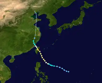 On June 19, an area of convection developed southeast of Yap and by 18:00 UTC, was centered 278 km (173 mi) east-northeast of Palau. Rapid development occurred and the disturbance became identified as Tropical Depression 04W by the JTWC at 21:00 UTC. After entering the PAR and receiving the name Emong by PAGASA, the depression intensified into a tropical storm on June 20.[17] Chebi headed northwest while being located east of the Philippines on June 21 at 06:00 UTC, and would later attain severe tropical storm intensity, before intensifying further to a typhoon the following day.[13] Chebi reached its peak intensity on June 23, before a trough forced Chebi west and northwest where it made landfall near Fuzhou City, China.[17] Chebi rapidly weakened while accelerating northward, and would degrade into an extratropical cyclone on June 24.[13] Its remnants were last noted by the JMA along with other weather centers before dissipating on June 30.[17]