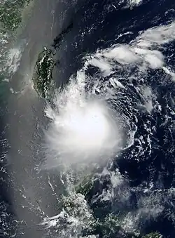 Tropical Storm Trami originated from a disturbance that developed about 222 km (138 mi) northwest of Chuuk on July 3.[11] Bursts of deep convection near the center were observed on the 7th, although the system remained disorganized.[27] Organization improved and by July 8, was upgraded to a tropical depression. Moving northwestward, the system gradually intensified, and the PAGASA began initiating advisories on 18:00 UTC of the same day, naming the system, Gorio. Six hours later, the JTWC already deemed the system as Tropical Depression 07W. Deep convection persisted to the west of its well-defined, but a partially exposed center. Thus, the system gained strength into a tropical storm, with the JMA naming it as Trami. Northeasterly shear prevented the storm to significantly intensify, and therefore Trami maintained tropical storm intensity for a day — only peaking with 10-minute sustained wind speeds of 75 km/h (45 mph).[27][13] By 12:00 UTC of July 11, Trami moved over Taiwan and into the Taiwan Strait, where Trami rapidly weakened and dissipated.[13] No other storm weakened into a tropical depression over Taiwan until Typhoon Krathon did so on October 4, 2024.[28]