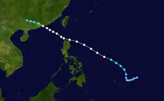 Utor spawned from an area of convection that developed off 907 km (565 mi) south-southeast of Guam on June 26, that remained quasi-stationary for 2 days before upgrading to a tropical depression on July 1 due to favorable conditions such as low vertical shear.[27] The depression strengthen into a tropical storm at 00:00 UTC on July 2.[13][27] Utor tracked west-northwest from a peripheral ridge and developed further, after entering the Philippine Area of Responsibility, and attained severe tropical storm status the following day. Utor was a large cyclone, with gale-force wind of 250 nmi (465 km; 290 mi).[11] Utor reached its peak strength on June 4, with 10-minute winds of 110 km/h (70 mph) and 1-minute winds of 150 km/h (95 mph), with the barometric pressure of 960 hPa (28 inHg).[13][11] Utor was centered 56 km (35 mi) near northern Luzon and tracked northwesterly as it began to weaken.[27] The storm made landfall near the east of Hong Kong on July 5 and quickly weakened before being last noted on July 7 by the JMA.[13]