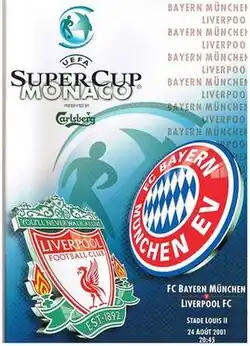 The 2001 UEFA Super Cup was a football match between German team Bayern Munich and English team Liverpool on 24 August 2001 at Stade Louis II, the annual UEFA Super Cup contested between the winners of the UEFA Champions League and UEFA Cup. Bayern were appearing in the Super Cup for the third time, their two previous appearances in 1975 and 1976 had ended in defeat. Liverpool were appearing in their fourth Super Cup, they won the competition in 1977, and lost twice in 1978 and 1984.