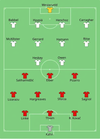 Liverpool kicked off the second half, and within 13 seconds they had scored to lead the match 3–0. Liverpool defender Jamie Carragher kicked the ball into the Bayern half, defender Thiam missed his header, which meant the ball dropped to Owen, who controlled the ball with his right foot and then put the ball into the Bayern goal with his left foot.[13] Bayern reduced the deficit in the 57th minute when Salihamidžić scored. He headed the ball into the Liverpool goal from Bayern's first corner of the match to reduce the deficit to two goals.[14] Midway through the half both teams made substitutions. Bayern replaced Sforza, Claudio Pizarro and Salihamidžić for Niko Kovač, Carsten Jancker and Roque Santa Cruz respectively. Liverpool substituted Gerrard and Riise for Igor Bišćan and Danny Murphy respectively.[14] Liverpool started to pass the ball around their midfield and defence in an attempt to waste time, however in the 82nd minute Bayern scored again. Substitute Jancker headed into the Liverpool goal from a cross by Elber.[13] Immediately afterwards Bayern had an opportunity to equalise, however Lizarazu's shot was straight at Liverpool goalkeeper Sander Westerveld. No further goals were scored and the referee blew for full-time with the final score 3–2 to Liverpool.[15]
